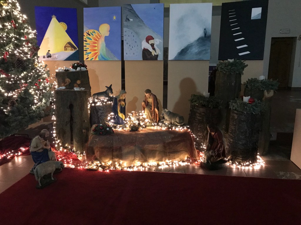 De kerststal in de kapel van Asster, met schilderijen van Sabine Pirlot.