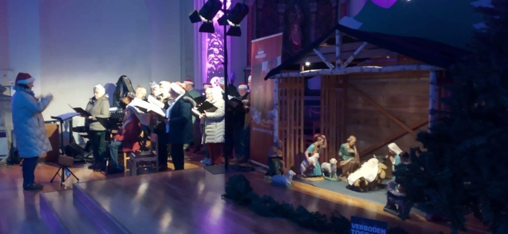 Tijdens de opening van de kerststallenwandeling op zaterdag 9 december 2023 zong het AMABILE koor Bevingen kerstliederen naast de kerststal van de minderbroeders Sint-Truiden.