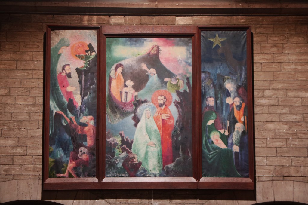 Kersttriptiek vooraan rechts in de Sint-Marten-kerk, van de hand van E. P. Norbertijn Kallist Fimmers (1906–1969).
