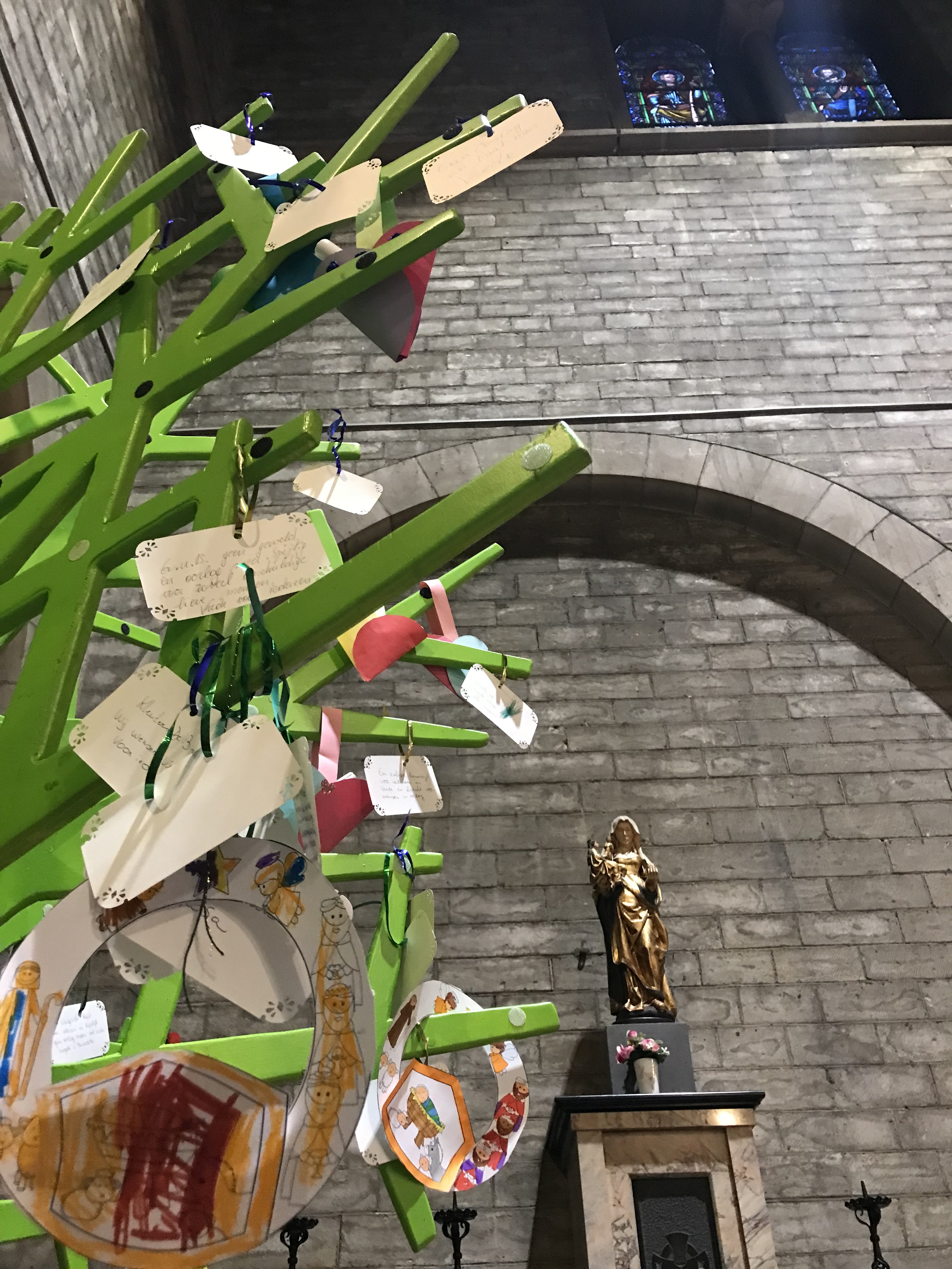 Links: de wensboom, rechts: klassiek wit-kalken kerstfiguren met later toegevoegd Jezuskind, geplaatst in het portaal van de kerk.