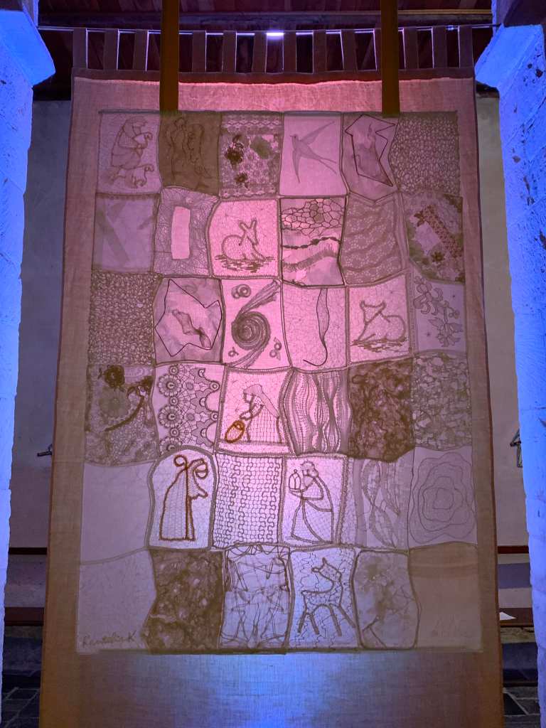 Dit wandtapijt werd gerealiseerd door de leden van KantelinK Kant- en Textielkunst Sint-Truiden. Je kan het bekijken tijdens de Kerststallenwandeling tot en met zondag 7 januari 2024 in de St. Gangulfuskerk (dagelijks tussen 9u en 19u).