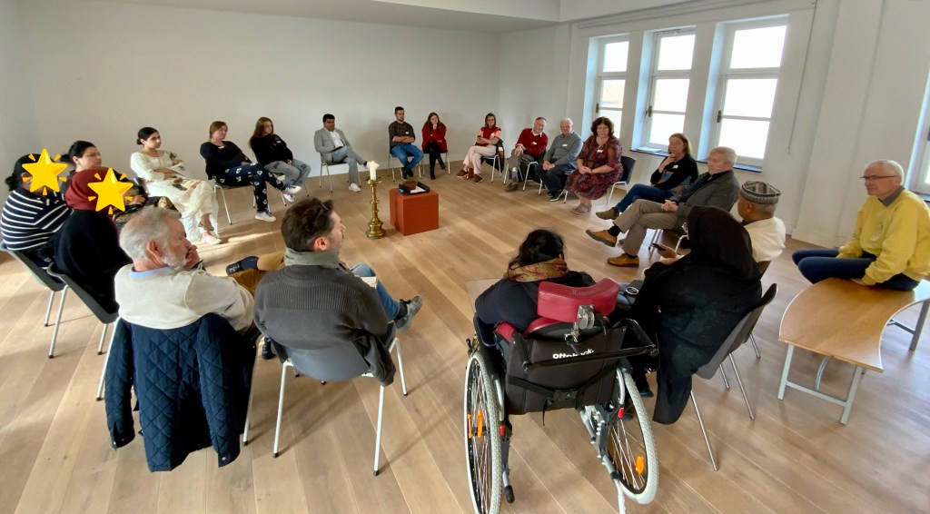 Minderbroeders en vertegenwoordigers van de Trudofederatie, de Ahmadiyya moslimgemeenschap, de Marokkaanse gemeenschap, de Sikh-gemeenschap en het huisvandeMens, samen rond een symbolische vlam. © DE MINDERE