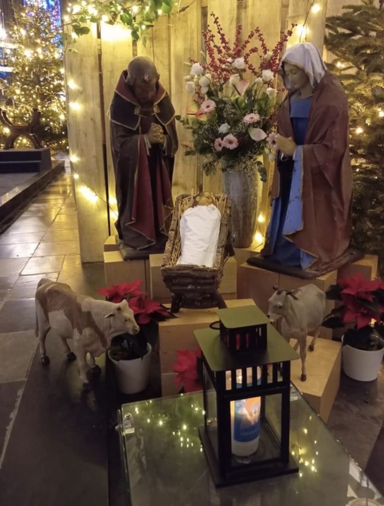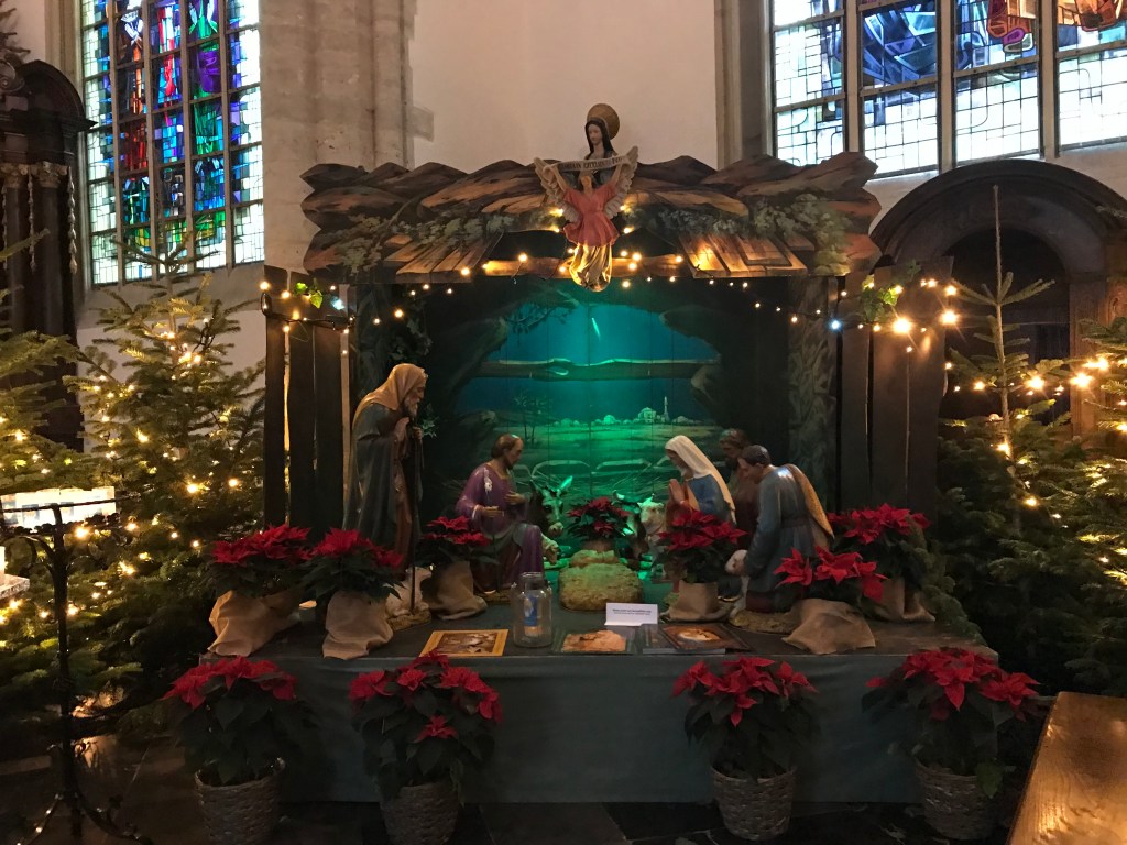 De grote kerststal stond rechts achteraan in de O-L-V-kerk. Bestaande uit gepolychromeerd hout en gepolychromeerde gipsen beelden, aangekocht in 1935 en sindsdien jaarlijks opgesteld. Volgens teruggevonden etiketten is de kerststal per trein aangekomen in Sint-Truiden.